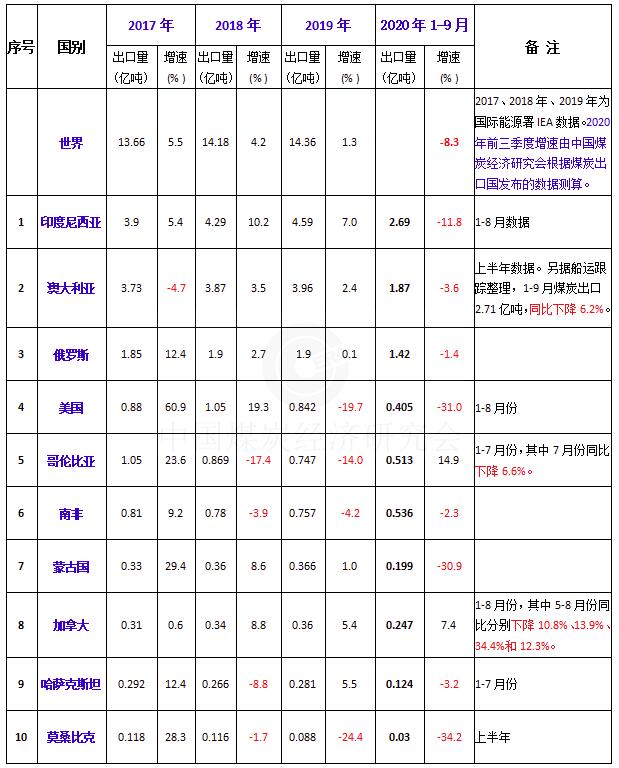 2020年前三季度全球主要煤炭出口國出口變化情況