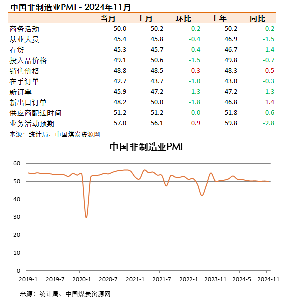 11月份,非制造業(yè)商務活動指數(shù)為50.0%,比上月下降0.2個百分點,位于臨界點。