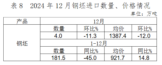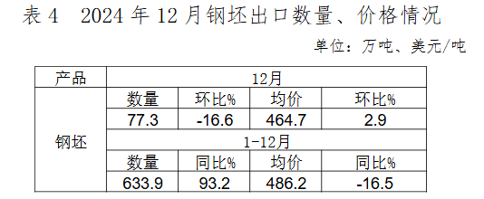 2024年12月,棒線材、焊管出口環(huán)比增長(zhǎng)幅度較大,熱軋薄寬鋼帶、冷軋薄寬鋼帶、厚鋼板等板材類產(chǎn)品出口環(huán)比下降,鋼筋出口環(huán)比大幅下降。出口的主要品種為鍍層板(帶)、中厚寬鋼帶、熱軋薄寬鋼帶、涂層板(帶)和中板,占12月鋼材出口總量的50.3%。熱軋板卷、鍍層板等主要品種出口均價(jià)小幅回升,電工鋼出口數(shù)量環(huán)比增長(zhǎng),價(jià)格大幅下降。12月鋼坯出口量環(huán)比下降,價(jià)格環(huán)比上漲。
