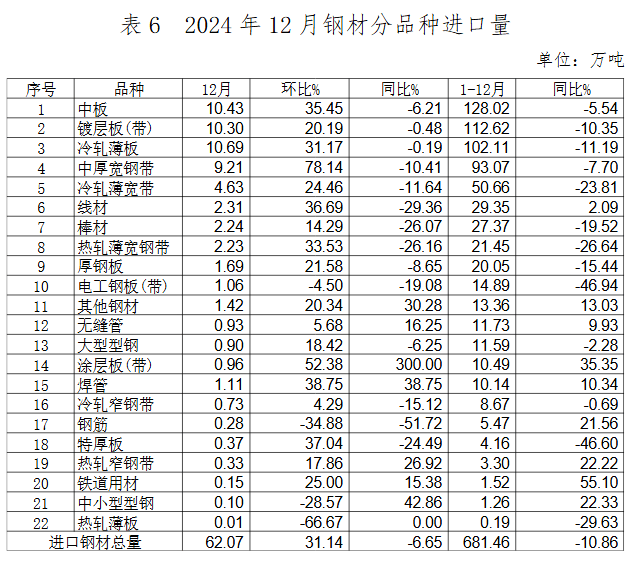 2024年,我國(guó)鋼材的主要進(jìn)口來(lái)源及結(jié)構(gòu)仍保持穩(wěn)定,進(jìn)口產(chǎn)品以板材為主,日韓仍是我國(guó)鋼材進(jìn)口主要來(lái)源。2024年,我國(guó)鋼材進(jìn)口數(shù)量持續(xù)下降,進(jìn)口量較大的品種為中板、鍍層板(帶)、冷軋薄板、中厚寬鋼帶和冷軋薄寬鋼帶。進(jìn)口量較大的品種全年進(jìn)口量同比均有較大幅度下降。12月進(jìn)口環(huán)比增幅較大,主要品種環(huán)比進(jìn)口量均有較大幅度增長(zhǎng)。