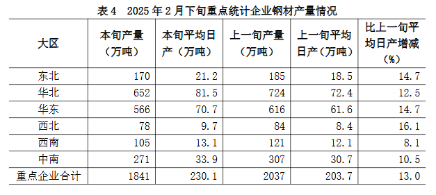 2025年2月下旬,重點(diǎn)統(tǒng)計(jì)鋼鐵企業(yè)共生產(chǎn)粗鋼1807萬(wàn)噸,平均日產(chǎn)225.9萬(wàn)噸,日產(chǎn)環(huán)比增長(zhǎng)5.0%;生鐵1589萬(wàn)噸,平均日產(chǎn)198.6萬(wàn)噸,日產(chǎn)環(huán)比增長(zhǎng)4.1%;鋼材1841萬(wàn)噸,平均日產(chǎn)230.1萬(wàn)噸,日產(chǎn)環(huán)比增長(zhǎng)13.0%(見(jiàn)表1)1。